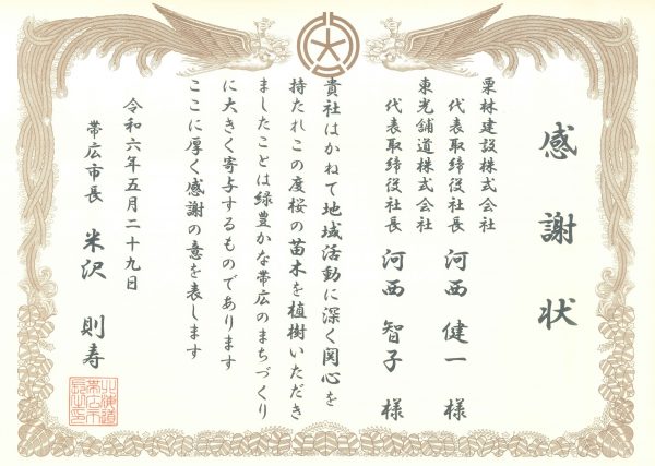 桜苗木植樹 2024.05.29 当社では、平成22年より帯広市八千代公共育成牧場で桜の苗木を植樹しております。 八千代公共牧場周辺に建設現場があったことから、より魅力的な観光地にしたいと植樹を始めてから14回目となり、牧場敷地内にこれまで1250本を植えました。これからも八千代牧場が魅力的な観光地として存続していくための取組みとして継続してまいります。 帯広市長 米沢 則寿 様より感謝状をいただきました