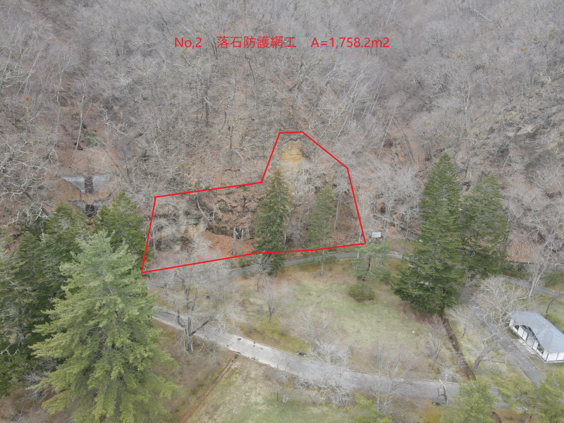 | 工事概要 | 山腹工 0.43ha №1落石防護網工 0.13ha №2落石防護網工 0.10ha №3落石防護網工 0.18ha 仮設工 一式 |